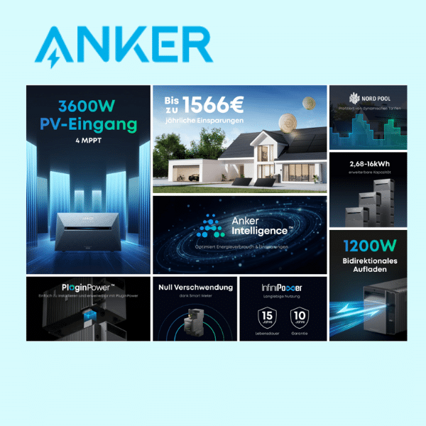 | Steuerung | Anker App (iOS & Android) + SmartMeter für automatisches Energiemanagement |