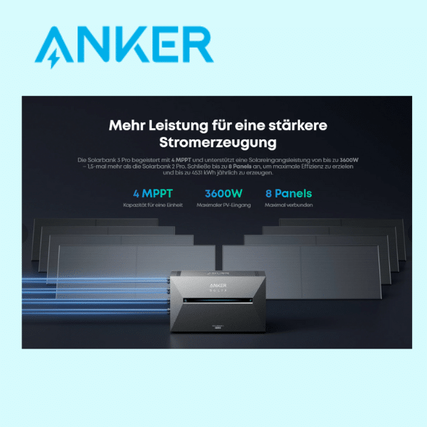 Der PRO 3 ist Ankers aktuelles Flaggschiff-Speichersystem für Balkonkraftwerke. Er integriert Akku, Wechselrichter und Solarregler in einem einzigen Gerät. Vier MPPT-Eingänge ermöglichen den Anschluss von bis zu 8 Solarmodulen mit bis zu 3.600 W Gesamtleistung.